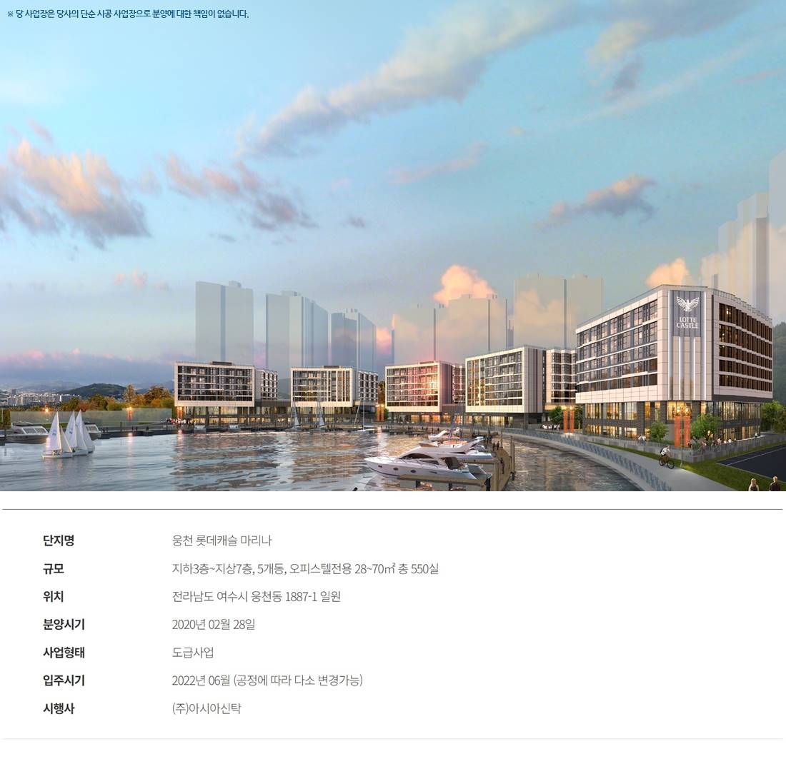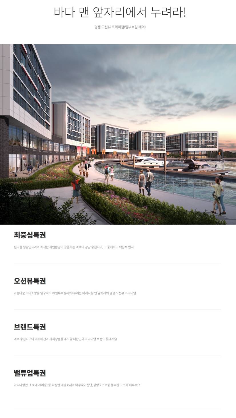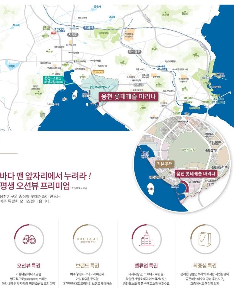 여수 웅천 마리나 시티의 중심 오션뷰와 마리나를 품은 여수 최고의 랜드마크 입지 웅천지구의 핵심인 마리나 시티에 위치하여 빼어난 해양 조망과 함께 복합적인 해양 레저 인프라를 누립니다. 전 세대에서 누리는 파노라마 오션뷰 가구 내에서 여수 바다와 마리나를 감상하는 특권 탁월한 입지 설계를 통해 단지 전체가 바다를 향하고 있어 영구적인 오션뷰 조망(일부 제외)이 가능합니다. 롯데캐슬 브랜드의 고급 주거 시설 총 550여 실, 최고 41층의 압도적인 스케일 총 550여 실 규모의 생활숙박시설(레지던스)로 조성되며, 최고 41층의 높이로 여수 스카이라인의 중심을 이룹니다. 웅천지구의 완성된 생활 인프라 롯데마트, 대규모 상업시설 등 편리한 생활권 웅천지구 내 롯데마트, 종합병원(예정), 호텔 등 신도심의 완성된 생활 편의 시설을 가까이에서 이용합니다. 프리미엄 커뮤니티 및 컨시어지 서비스 마리나 뷰를 감상하는 고급 부대 시설 제공 피트니스, 라운지 등 고급 커뮤니티 시설과 함께 호텔식 컨시어지 서비스를 통해 삶의 가치를 높입니다. 해양 레저 및 휴양의 복합 단지 요트 정박 시설과 해변 공원을 도보로 이용 단지 바로 앞 마리나와 인접하여 요트, 카누 등 해양 레저를 자유롭게 즐길 수 있는 환경이 조성됩니다. 여수 KTX역 및 여수 공항 광역 교통 인접한 엑스포대로를 통한 시내외 빠른 연결 여수 KTX역, 여수 공항, 엑스포대로 등 육상 및 항공 교통망 이용이 편리하여 접근성이 뛰어납니다.